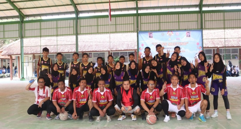 Slawi - Sorak penonton memenuhi area indoor MTs Negeri 2 Tegal pada Senin pagi (8/12). Laga eksibisi pembuka Class Meeting 2025 mempertemukan dua generasi dalam satu lapangan. Tim guru dan karyawan (The Legends) melawan starter Arion Basketball (Young Guns), tim basket MTs Negeri 2 Tegal.
